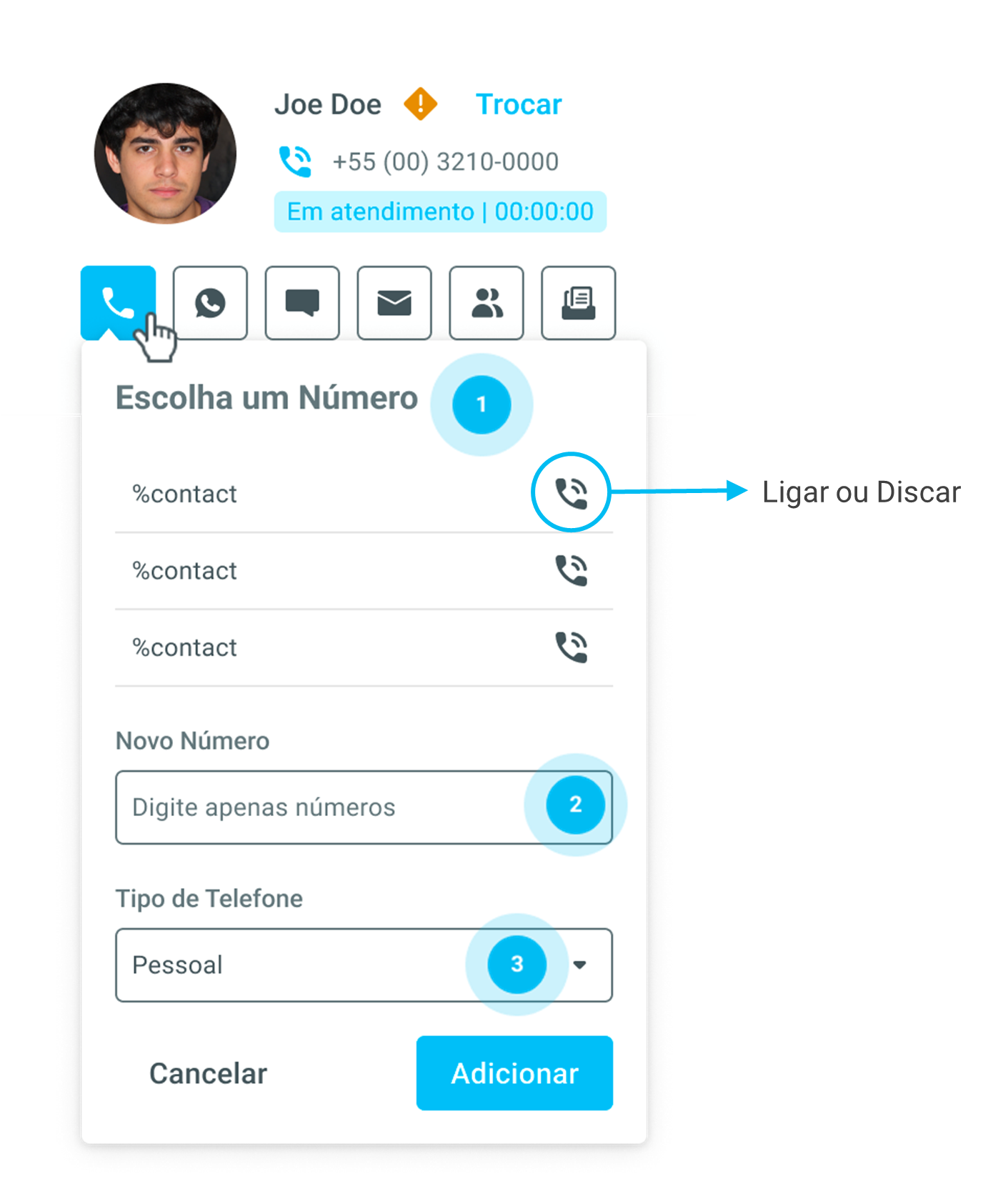 Escolha um Número: mostra os números de telefone cadastrados para o cliente relacionado ao atendimento, permitindo que você selecione um deles.